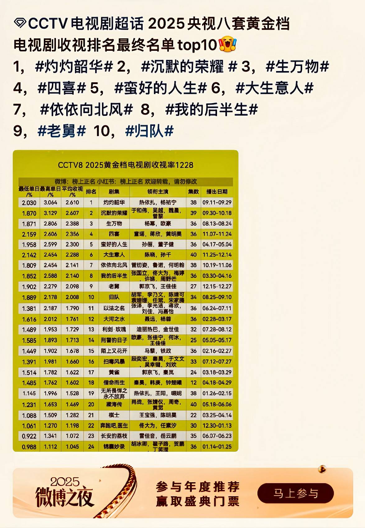 2025年央视八套首播电视剧收视率前十名