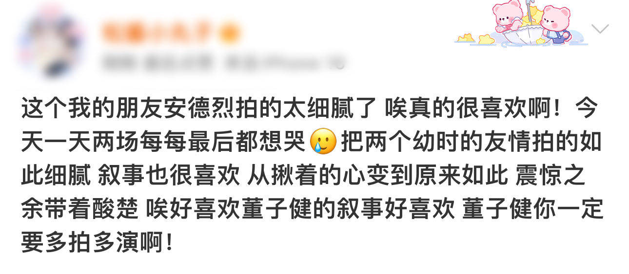 整部电影都流淌着一种“润物细无声”的情感力量。它让我们为那些曾经拥有但已经逝去的陪伴而流泪,也为那些或许沉默却深如大海的关怀而感动。《我的朋友安德烈》能收获这么好的口碑,正是因为它成功地挖掘并呈现了这种真挚的情感,看完之后每个人都会想起自己年少时的那个“安德烈”。在现在这个有点浮躁的环境里,董子健这份老老实实讲好一个真情故事的初心,显得特别难得,也特别珍贵。